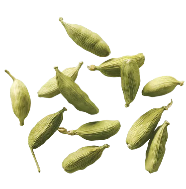 These small, spindle-shaped pods are pale green in color. Green cardamom has a sweet, eucalyptus-like flavor with complex floral notes. It’s highly aromatic, making it a favorite for both sweet and savory dishes. Green cardamom is one of the most expensive spices by weight.
